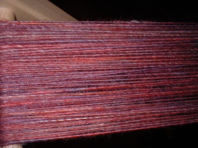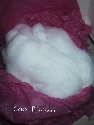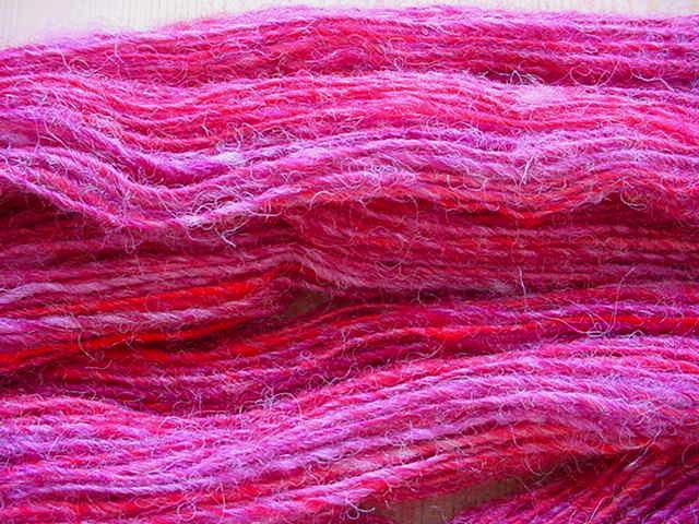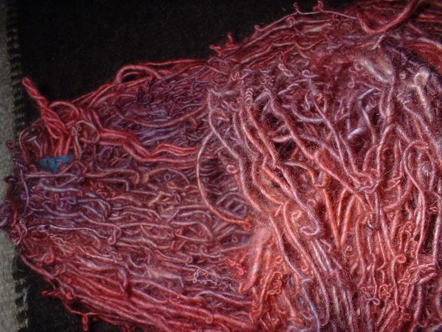 Laine d'origine inconnue que Carine m'a donné. J'ai teint une nappe en rouge, et une nappe en violet, j'ai recardé le tout et voilà. |