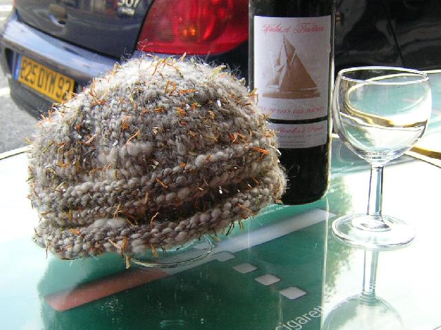 Voici un chapeau que j'ai tricote pour ma niece, Lorna, qui est frileuse apres avoir quitte le mas de riols. C'est du fils file que Joelle a file et qu'elle m'a offert. |