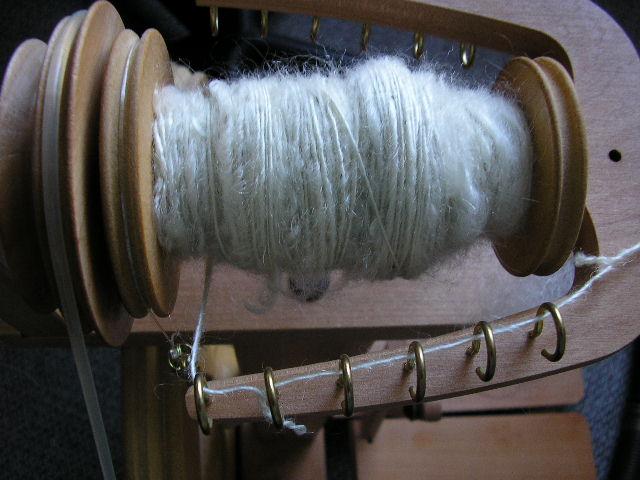 Ce week end, j'ai cardé 50g de mohair car il est plein de brindille. Et voici que je j'ai filé. |
