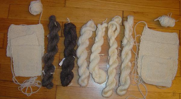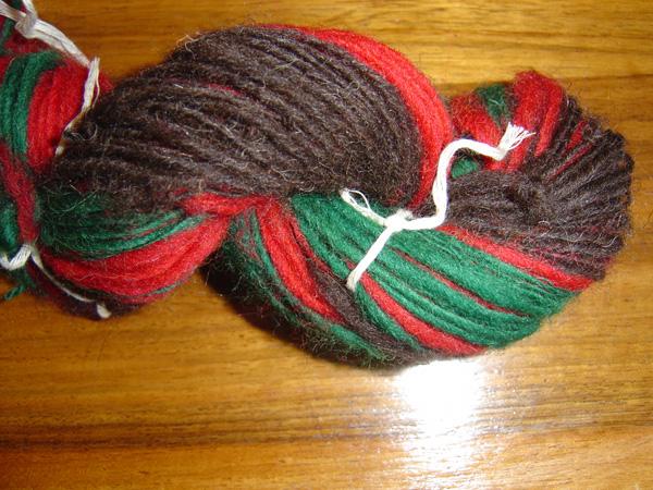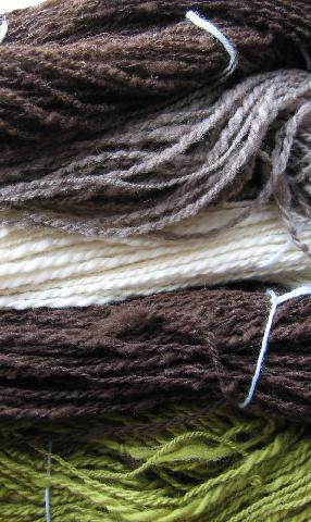Encore (!) des laines ashford, filées dans un but encore inconnu, pas très régulièrement d'ailleurs... Pour des aiguilles 4 ou 2mm selon. Du mérinos (naturels, teint vert), et de l'oppossum (gris) |