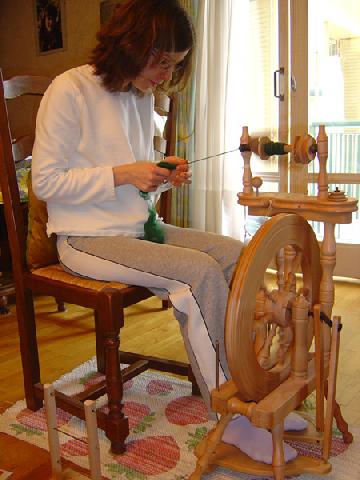 ma fille qui essaie le rouet ashford pour la 1ere fois |