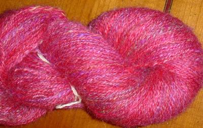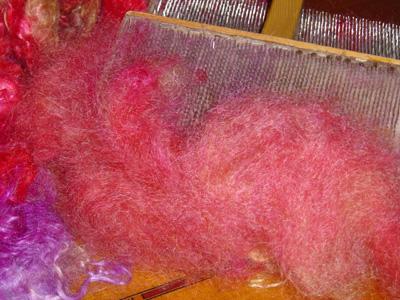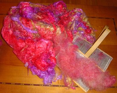 Mélange en proportions variées de rouge, jaune-orangé et rose-bonbon, avec une pointe de rouge foncé. Le tout mixé à l'aide de ma cardeuse à rouleau. |