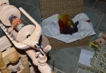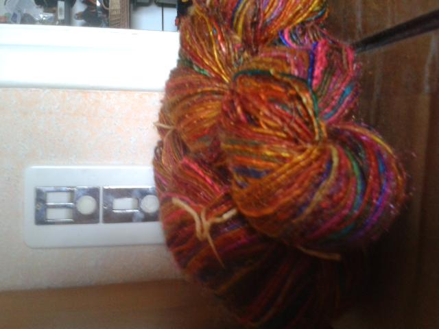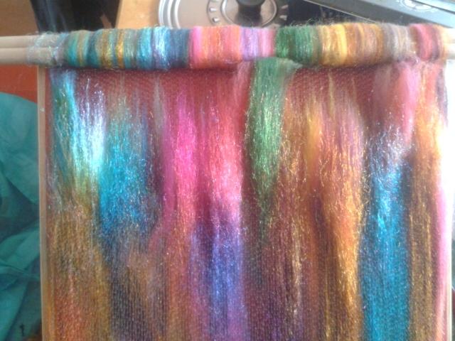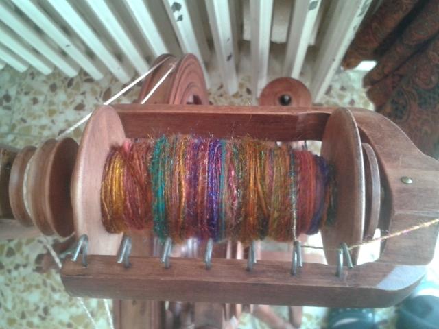 file naturel au fuseau, arc-en-ciel teintures végétales, nappes arc-en-ciel, fil d'or et d'argent plus fil avec charmes filé autour avec rouet Minstrel |