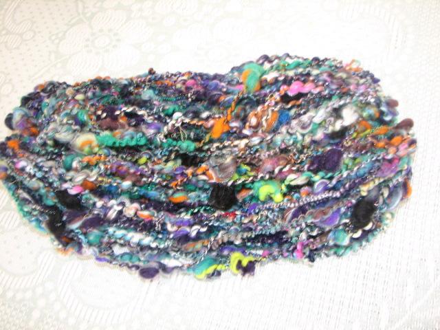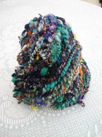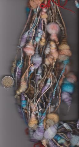Moche toison intriable (mauvais achat). J'avais craqué sur l'aspect multicolore du mouton jacob ! J'ai failli la jeter puis je me suis ravisée, j'ai TOUT cardé grossièrement, les fibres courtes, les bouboules, j'ai tout filé en irrégulier (c'était pas compliqué) et retordu avec un lurex argent. 125m/80 gr Résultat doux, gonflant, chamarré, me suis bien amusée. |