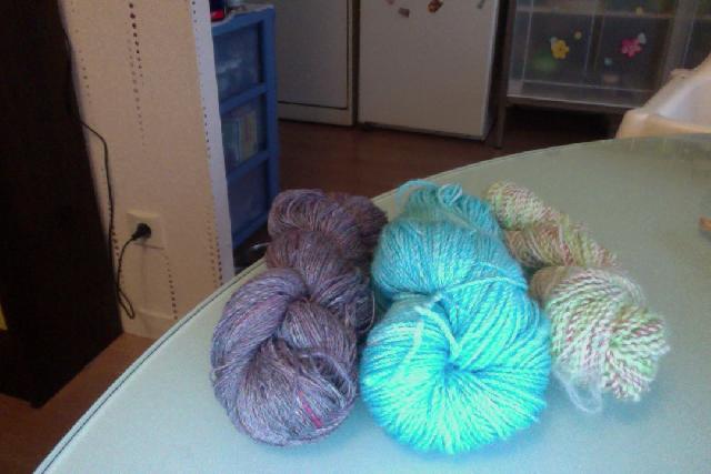 Mes premiers écheveaux corrects je trouve, le bleu et le vert et rose teint avec des teintures alimentaires, le dernier du mérinos déjà teint. |