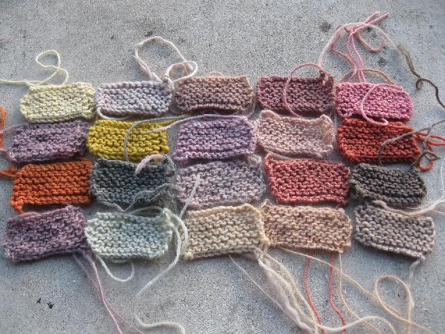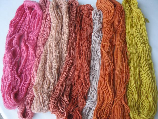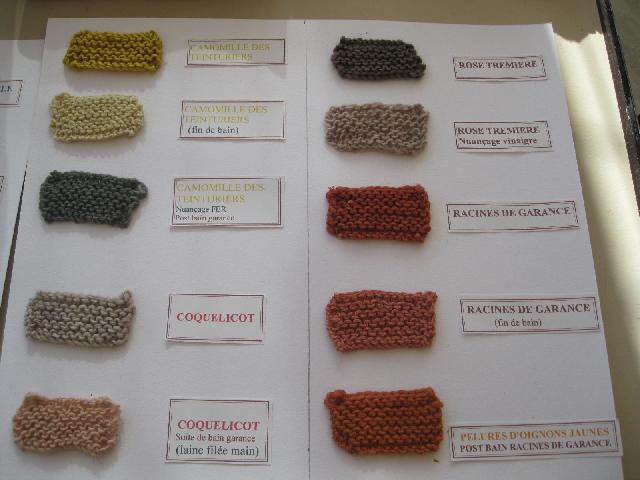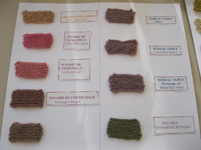 Sur cette photo essais ; de cochenille, garance, camomille des teinturiers, coquelicot, garance sur oignon jaune |
