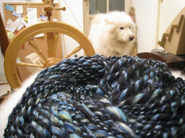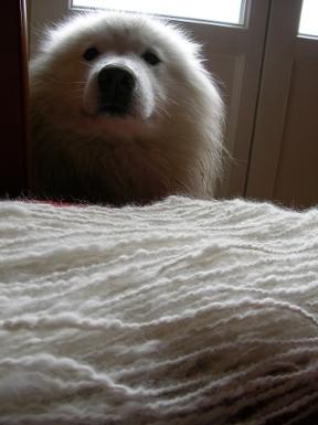 voilà une photo de mon fournisseur de laine canine, et du premier écheveau de ses fibres |