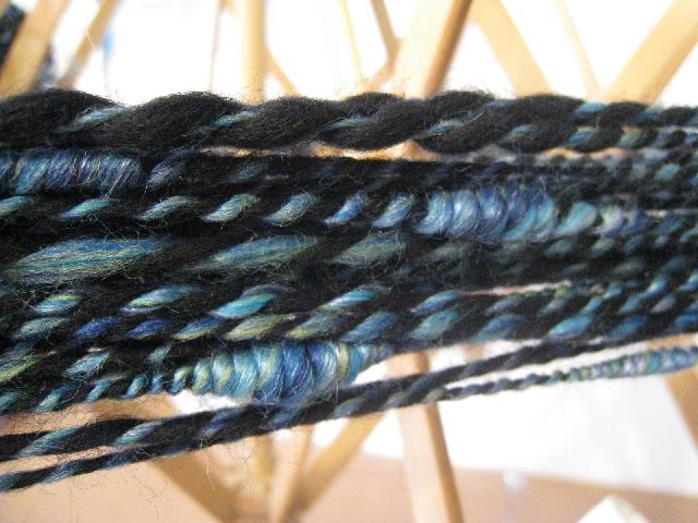 Fil fantaisie 2 brins, un noir (mérinos) et un bleuté (mélange 70% de mérinos et 30% de soie) |