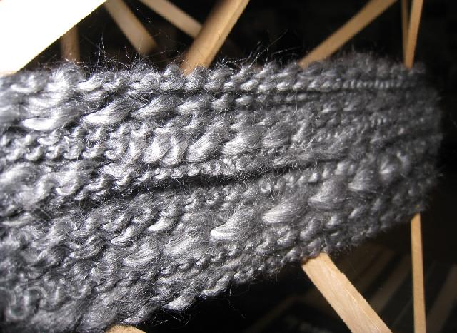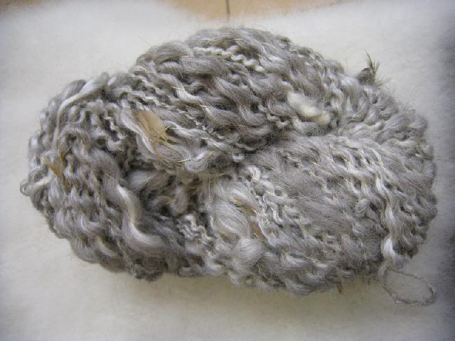 Alpaga gris/soie, plumes de ma cocotte croisée barbarie, retordu avec un fil de lin écru |