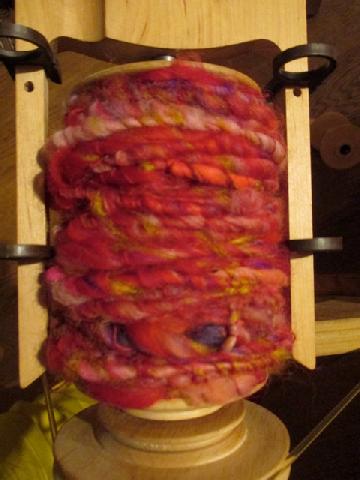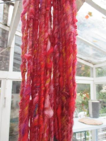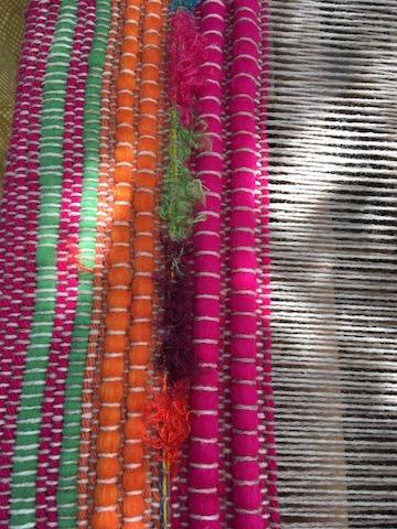 Le premier tapis sera très coloré, avec une majorité de rose fuchsia. ce projet nous permet d'apprendre à travailler la laine mèche, et des laines de tailles très différentes. |