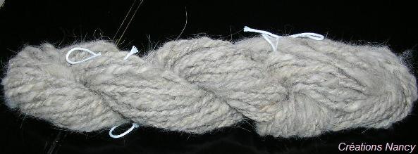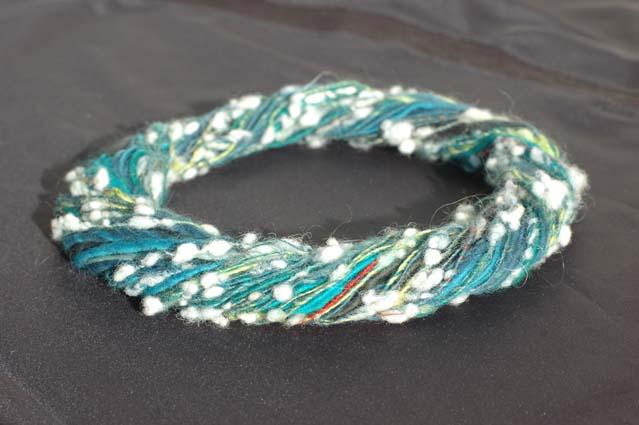 Collier Moëbius: le fil utilisé a été filé avec les petites boules de laine, certaines sont parties en cours de travail , mais celles qui restent sont bien accrochées au fil. |