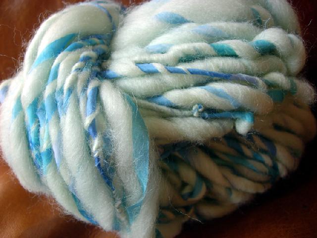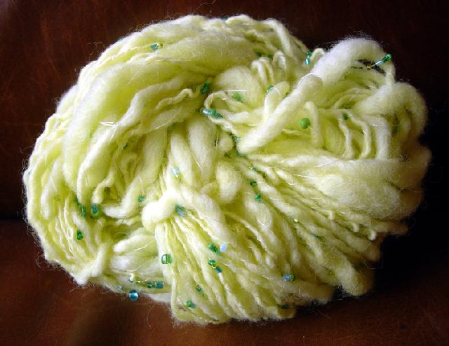 Laine teinte au jaune Vahiné au micro-ondes, filée en "flammé" et retordue avec du fil à coudre enfilé de perles. |