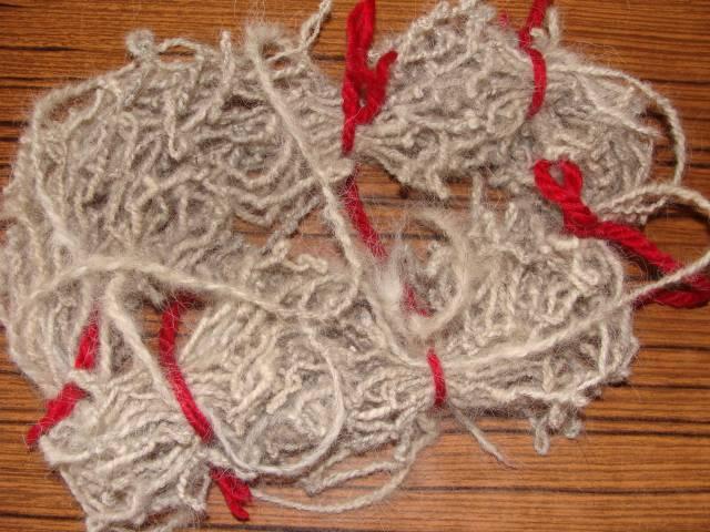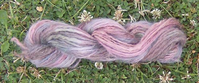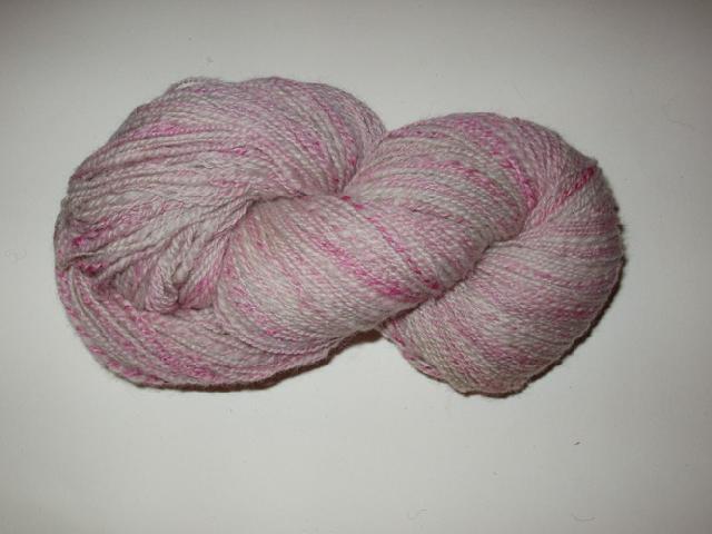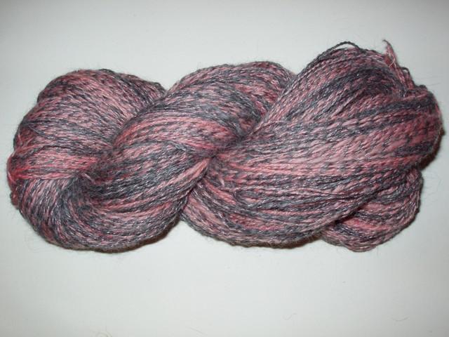 Un retors trois fils: alpaga gris, merinos rose (teint à la main) et fil de viscose brillant rose |