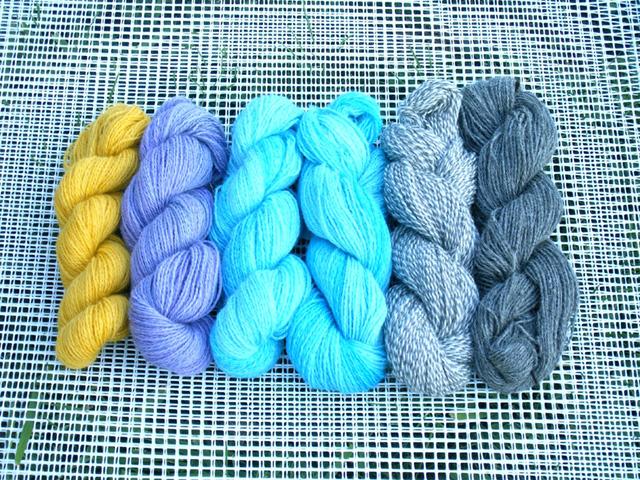 De gauche à doite : colorant Wilton jaune, Wilton violet avec quelques gouttes de rouge Vahiné, Bleu brillant de Maman Mouton, retors de naturel gris et blanc, naturel gris. |