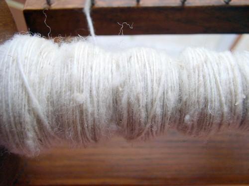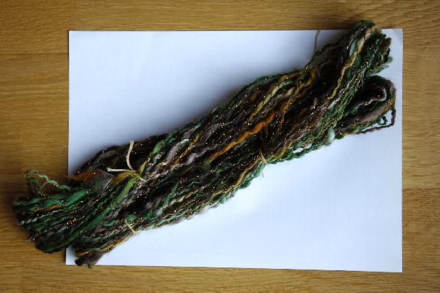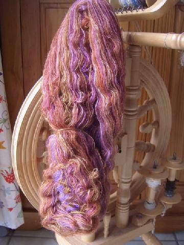 laine en ruban achetée à la "droguerie"... pas moyen d'en savoir plus... teinte avec de la one, filé sur mon little gem, retordu avec du lurex... il mesure 48m pour 35g et est hyper irrégulier !!!! |
