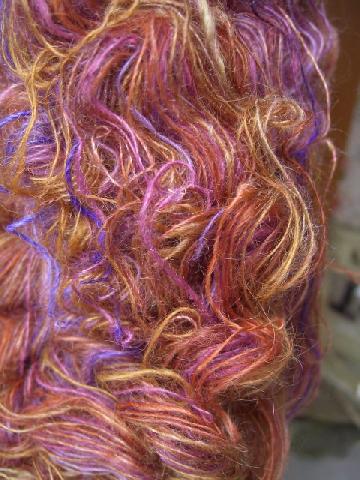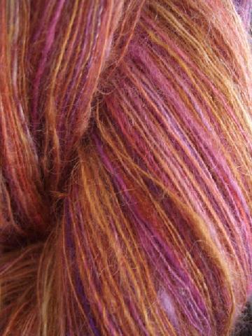 écheveau célibataire (mohair, wensleydale, soie tussah) filé "woolen backdraft" tout chaud sorti de l'écheveaudoir, non bloqué. (+/- 175grs et 975m) |