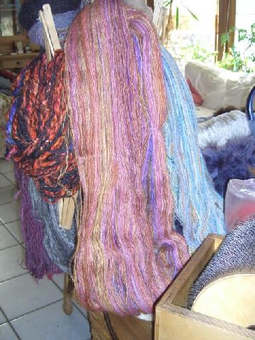 Peintures pour soie étuvable ONE sur blue-faced leicester, filage irrégulier, retors normal avec même fil, trop de torsion |