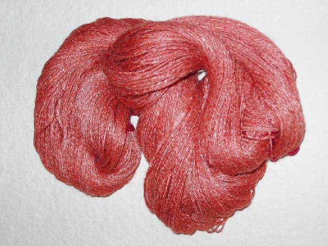 Deux brins, teint après filage aux teinture du mouchon, mélange de rouge et bleu |