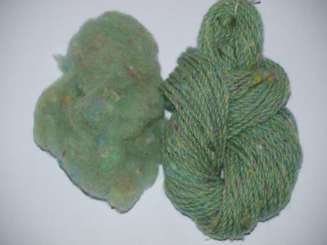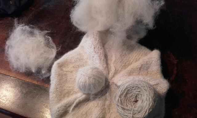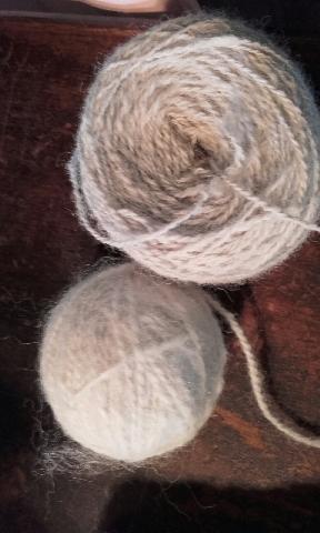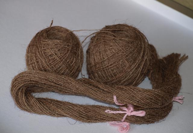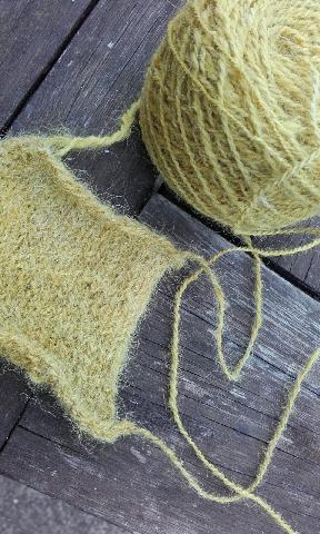 échantillon de lama filé main teint avec des bolets de quelet, lavé et mis au soleil plusieurs fois pour tester la tenue de la couleur et la douceur... |