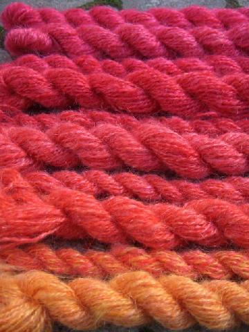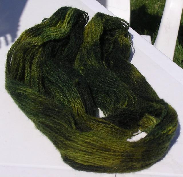 filé fin au rouet, retordu 2 brins, teint avec un mélange de teintures "Idéal" et de peintures pour soie. |