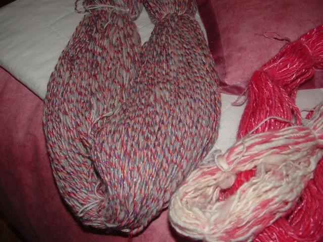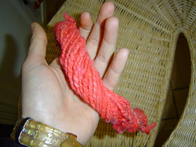 les deux rose laine toison bleu du maine , teinture de chez Florence mes premières expériences de filage.et de teinture. |