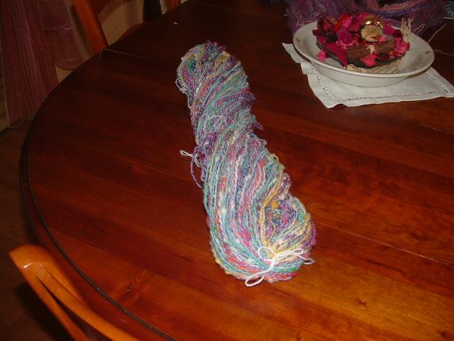 ici c'est une laine en nappe de chez Florence file assez fin , retordu avec un fil synthetique ,fait deux quatre brins très fin multicolors |