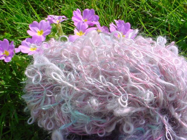 Un essai de fil bouclé. Célibataire en mohair (teint avec des colorants pour oeufs de Pâques), retordu une première fois avec un fil à broder rose clair, puis le tout retordu avec un autre fil rose plus soutenu qui fixe les boucles. |