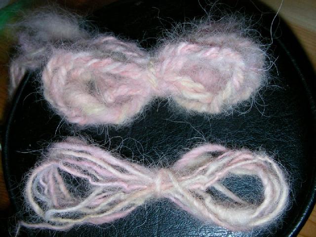 Poil de samoyède filé au fuseau (fait maison), teint au colorant alimentaire (première expérimentation en teinture également!), et retordu deux fois! |