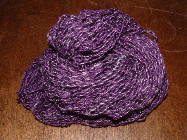 Agneau teinté au kool-aid et retordu avec un fil bergère de France Violet. POur la fantaisie, mon retors est irrégulier et frisotte ! |