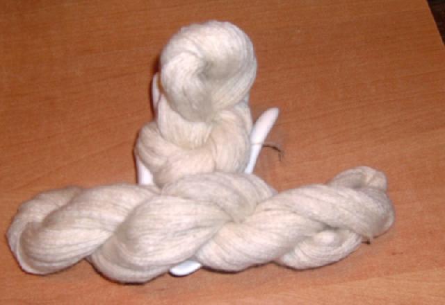 J'ai finalement retordu le Yorkshire qui continuait à vriller et en plus me paraissait très fragile, avec le fil donné par le poil du chien crème non identifié, lol. |