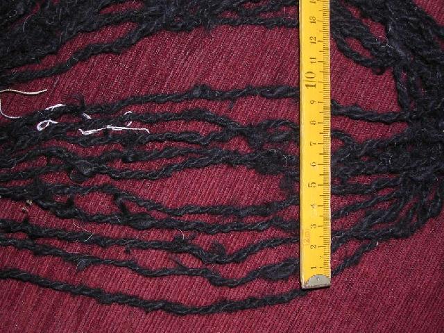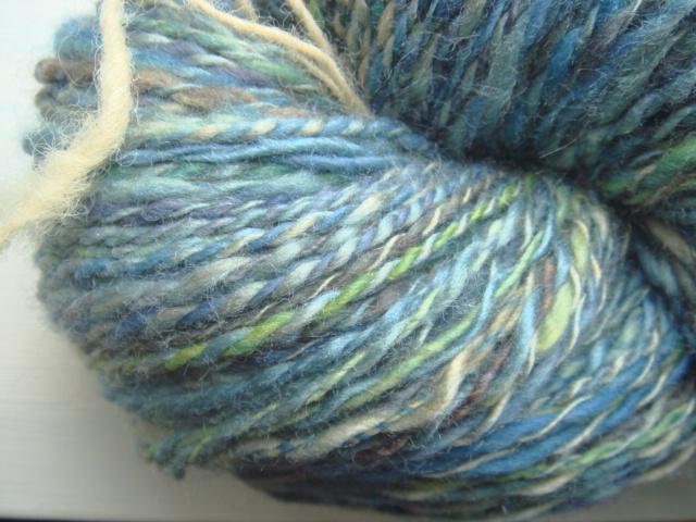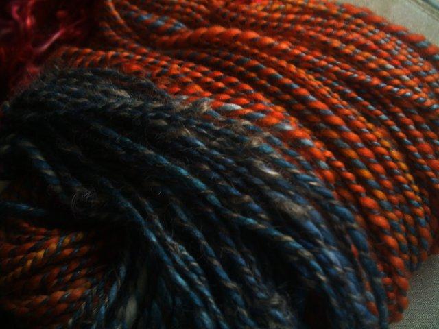 Mérinos acheté déjà teint sur ebay. Filé au fuseau et retordu deux brins. Je n'en ai jamais rien fait, sinon de l'utiliser comme témoin des progrès que j'ai accomplis depuis. |