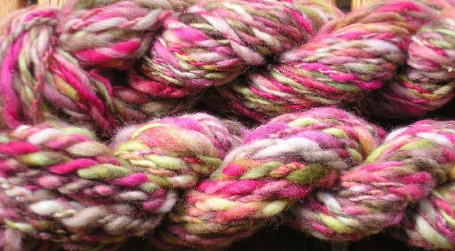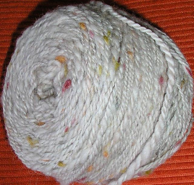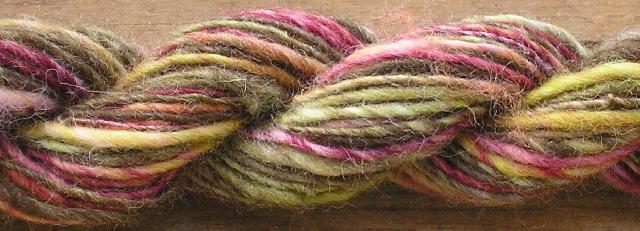 Mérinos et lama mélangés aux cardes à main et tweedés avec des restes de fils colorés (vert, orange, fushia) légèrement feutrés. Retords deux brins. |