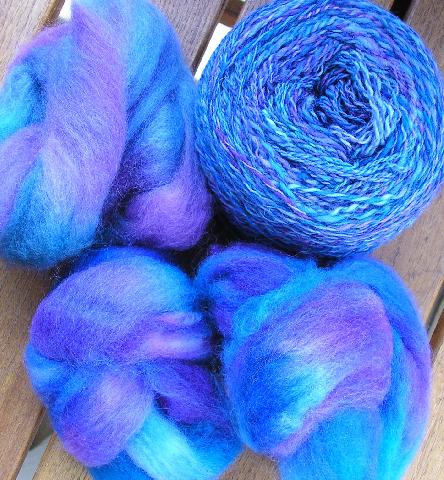 Mèche de mérinos peinte dans deux tons de bleus et le fil, deux brins, très fin. |