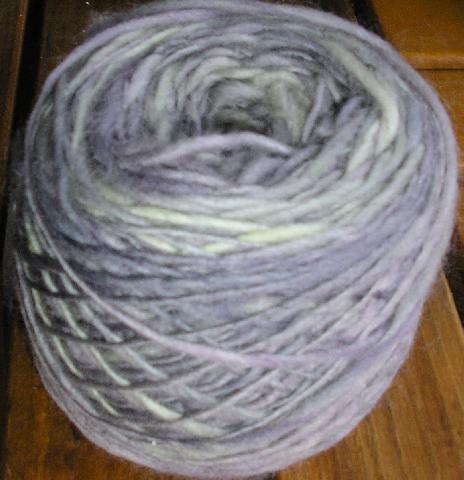 BFL teint à la main (teinture versée dans la casserole sur la mèche chauffée), dans des teintes de gris-mauve et gris-vert. Filé en célibataire sur rouet Joy. |