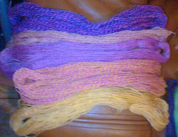 J'ai teint de la toison avec seulement deux couleurs: le jaune à droite et le violet à gauche. J'ai obtenu la couleur du milieu en mélangeant le jaune et le violet avec mes cardes à main. |