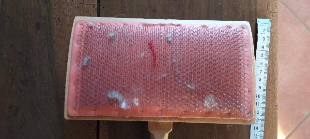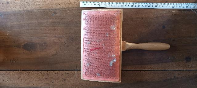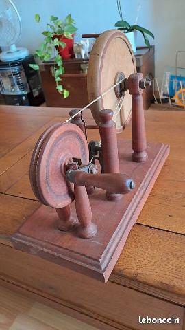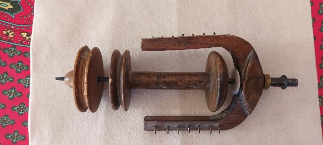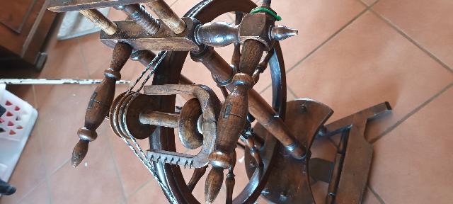 rouet à lin sans doute, bois blond, dents d'épinglier tres fines et rapprochées, double entraînement, 1 pédale présence de 2 colonnes avec bras articulés de part et d'autre de la demoiselle antérieure ( support de quenouille?) |