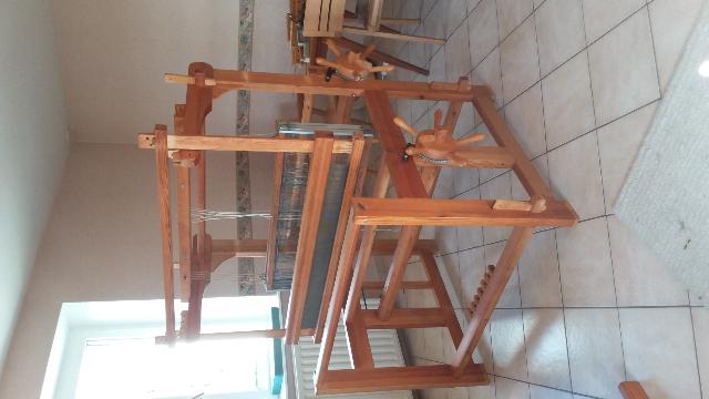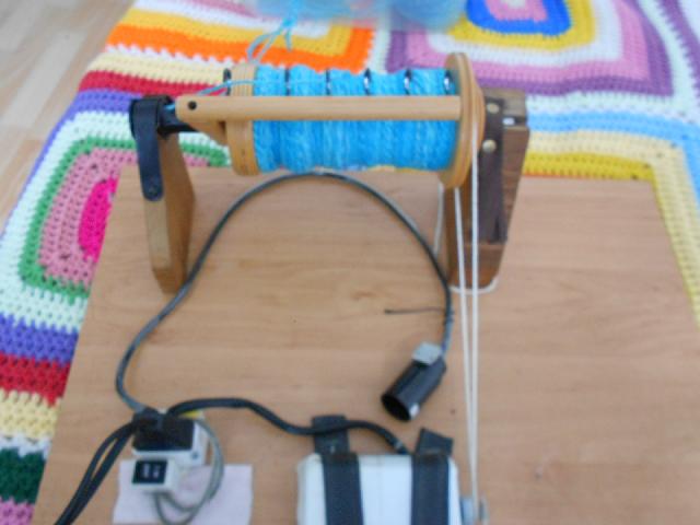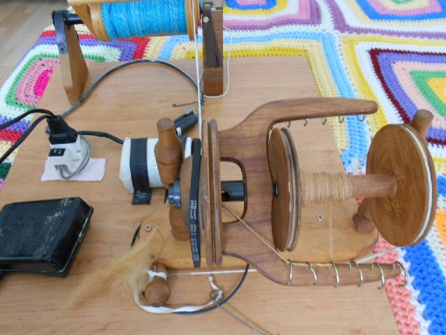 fabriqué maison avec épinglier et bobine Louet, support bricolé, moteur de récup de machine à coudre. |