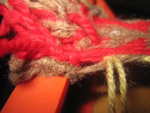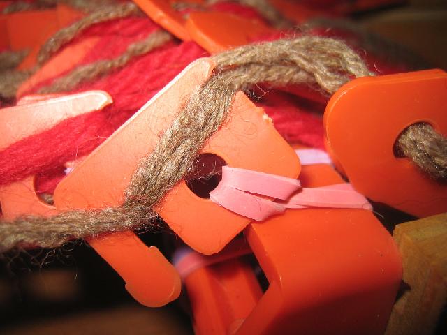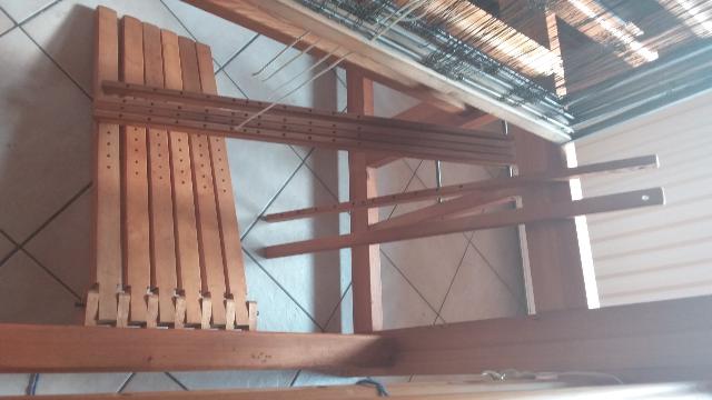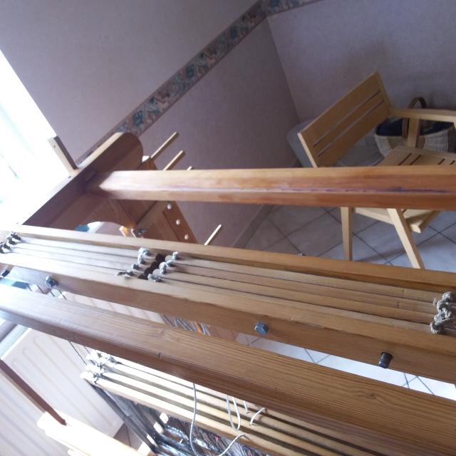 Les crochets sont décrochés, les navettes alignées dans l'ordre. on enroule la sangle tissée sur l'avant, on déroule les navettes, et on refixe dans l'ordre avec les crochets. |