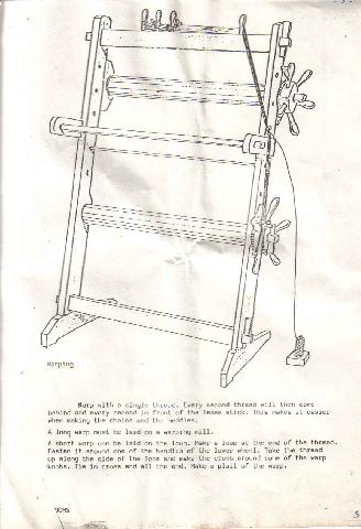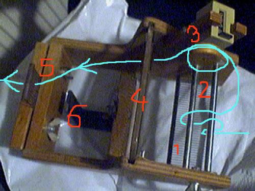 voici la boîte d'ourdissage qui se fixe sur le métier au-dessus de l'ensouple arrière, les fils entrent dans le premier peigne (1), passent dans un tendeur (2) ,on fait passer un des fils autour de la roulette du compteur métrique (3) et ensuite dans un autre peigne qui sépare les fils pour constituer la foule (4). les fils ressortent, à plusieurs par dent, par un petit peigne (5) qui a la largeur d'une section |