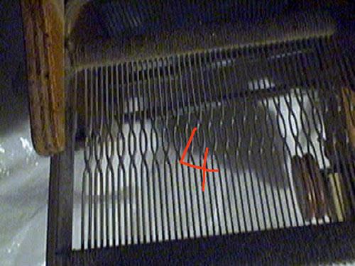 sur la photo précédente, en 6, la partie qui permet de fixer la boîte sur le métier, sur cette photo, un détail du peigne de séparation des fils |