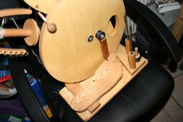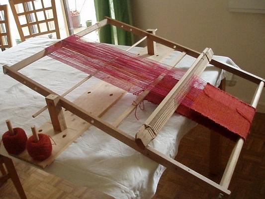 Voici comment j'ai construit pour mon Tissanova un support très simple; planche + 2 axes verticaux percés écartés de la largeur du métier+ un bois rond qui s'enfile dans les axes en profitant des trous du cadre. La planche de "récup" était déjà percée, des petits bois ronds encastrés sont devenus supports de pelotes. |