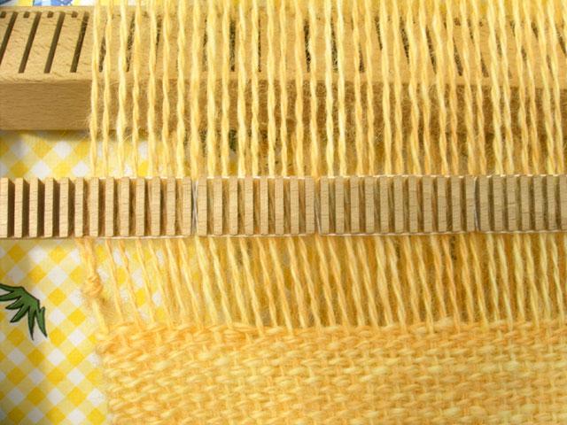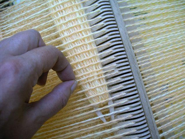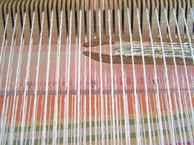 Une règle de 50 cm en plastique glissée entre les fils de chaine au ras de la barre Tissanova |