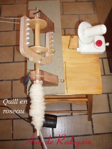 quill en roseau de 10 mm de diamètre, fixé en force dans le trou de l'épinglier de ma "makinafilé" pour faire des fils épais ou fantaisie. |