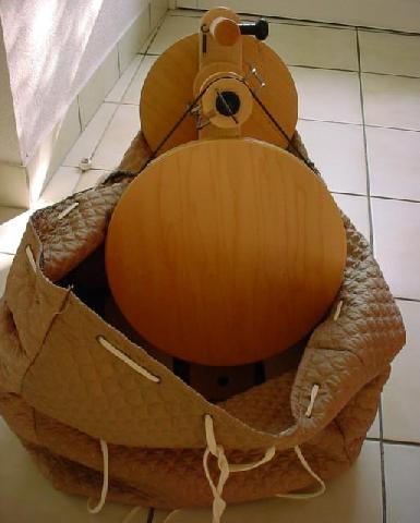 Voici le rouet complètement rangé dans sa housse. Et lorsque je ne me sers pas de mon rouet, je la pose à l'envers dessus pour le protéger de la lumière et de la poussière. |