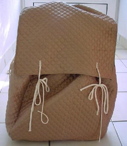 Voici la housse que m'a cousu mon Cher&tendre pour transporter mon rouet. Elle est en matelassé, et possède deux poches à l'intérieur, au niveau des pédales, de part et d'autre du rouet. |