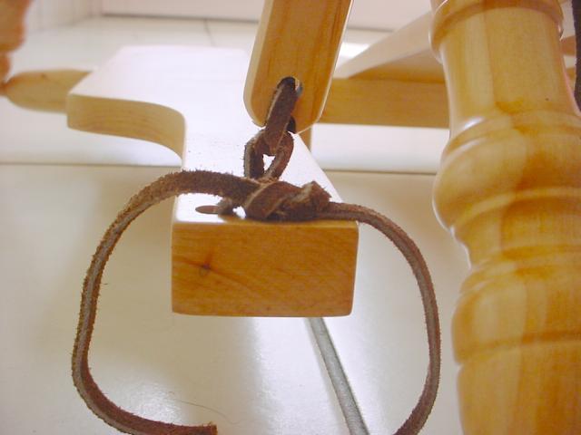 C'est un lien de cuir qui relie la bielle à la pédale, sur le Minstrel. C'est aussi pratique et confortable que les pièces plastiques habituellement utilisées. |