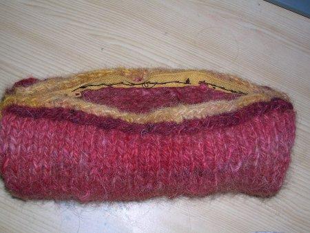 teinte avec des teintures "Idéal" et "Ibéria", filée, retordue "navajo" puis tricotée |