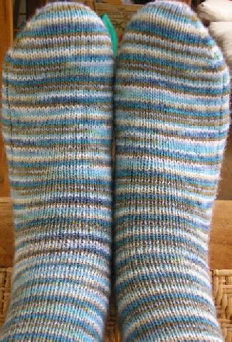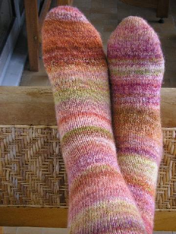 Les chaussettes réalisées avec de la laine peinte (mais non filée, malheureusement) à la main. |