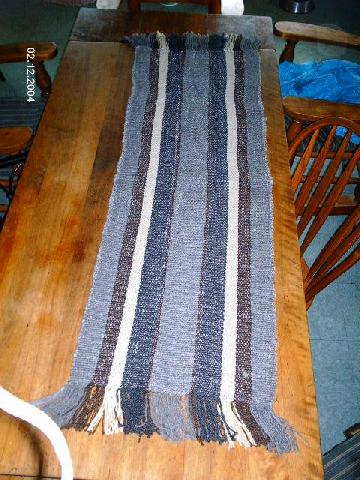 J'ai effectué ce tissage à partir de restants de laine Jacob(filée grossièrement pour la chaîne), Dorset et Icelandic(pour la trame). Il mesure 2 mètres par 60 cm. |