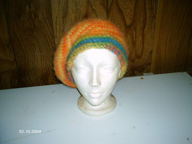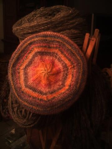 Mon bérêt est en fibre d'alpaga que j'ai teinte multi(dans les teintes d'oranger). Il est effectué au tricotin AJAL ajustable, je l'ai ensuite fait légèrement feutrer dans la laveuse. |